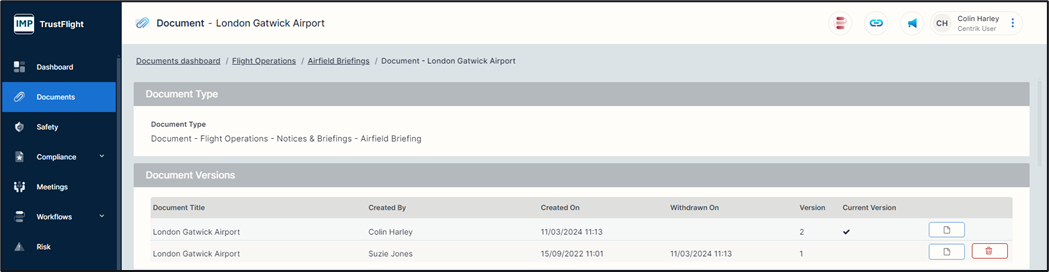 A new area will now be viewable titled ‘Document Versions’, this will display the previous version by title, who it was created by, when it was created, a tick to show it has been ‘archived’, its version and a tick to denote the current version of this document.