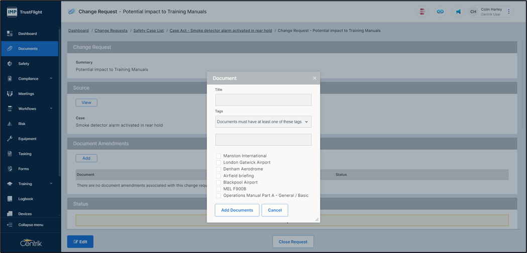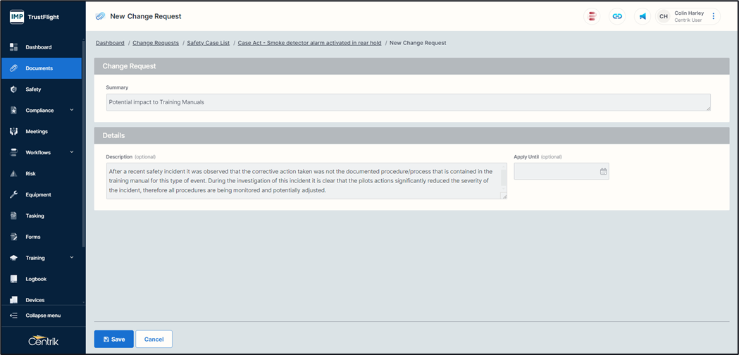 A change request can occur within a Safety case, an Audit finding, via a Regulation change or by a Document Manager within a document (if enabled to accept change requests).