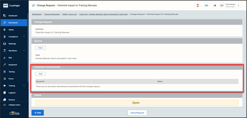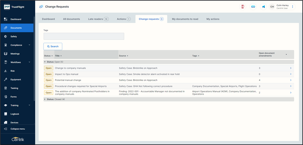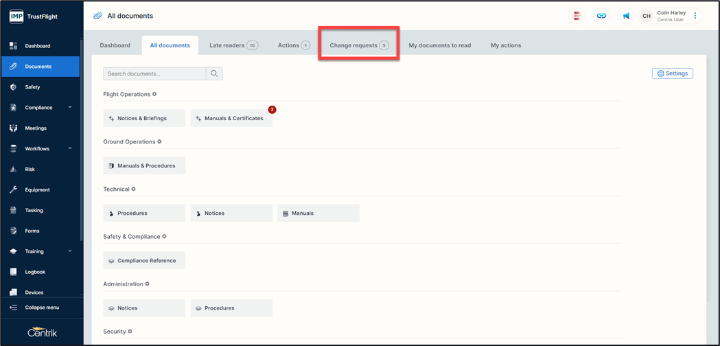 Change Requests can be viewed within each area (Safety, Documents and Compliance) by clicking on the Change Requests selection in the module summary page.