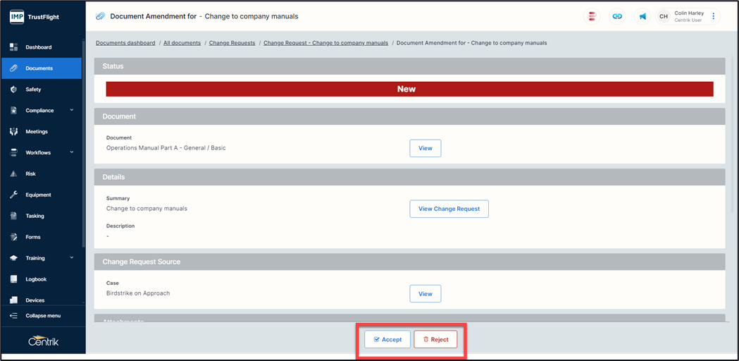 4. The Document Manager will then be able to Accept or Reject this change based on the documented information that has been provided via the View Change Request button.
