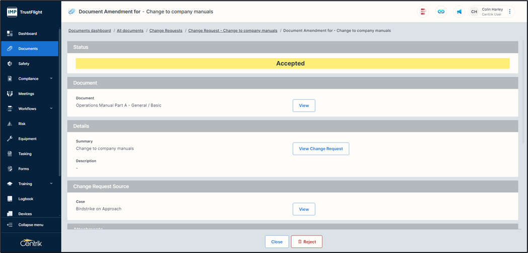 7. Within the Document Amendments area click on the ‘Close’ button (you can Reject the change here too)