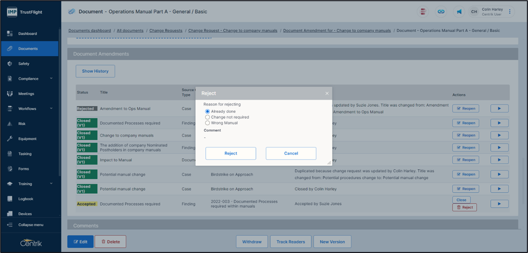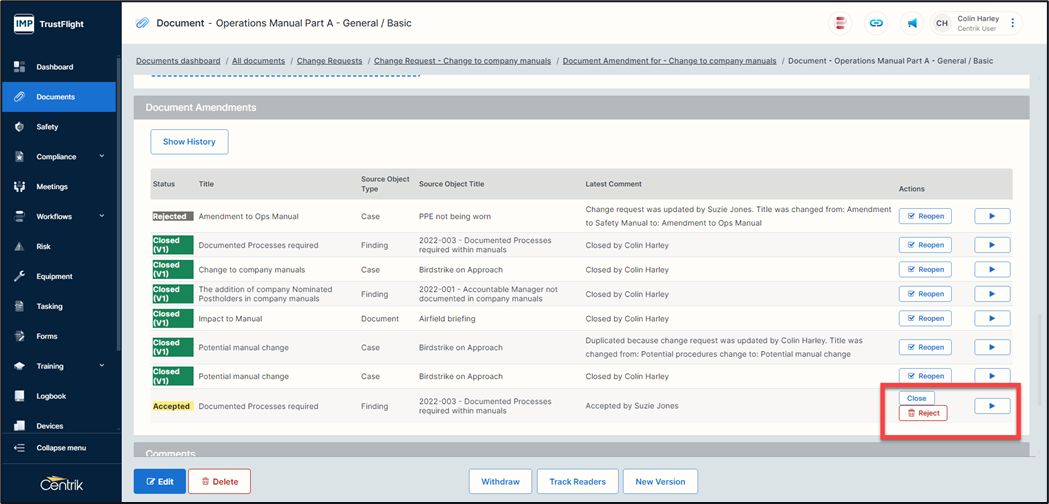 2. Within the Document Amendments area click on the ‘Reject’ button.
