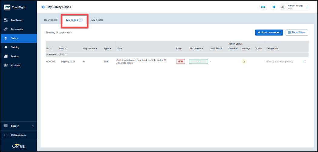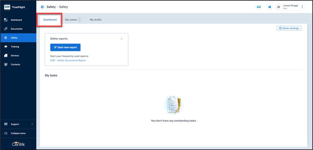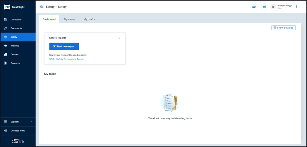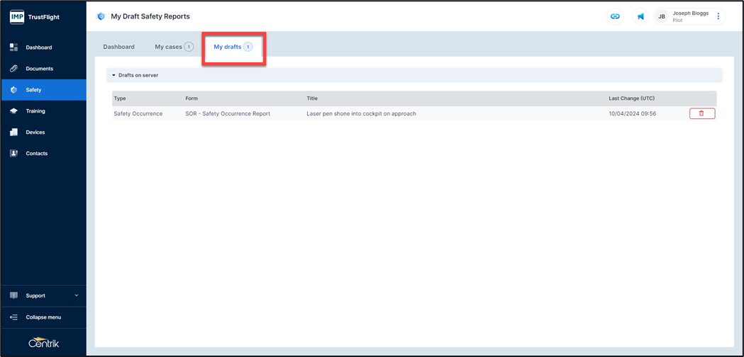 My drafts – An area where any draft safety reports that below to you are stored, reports can be updated prior to being submitted or draft reports deleted within this area.