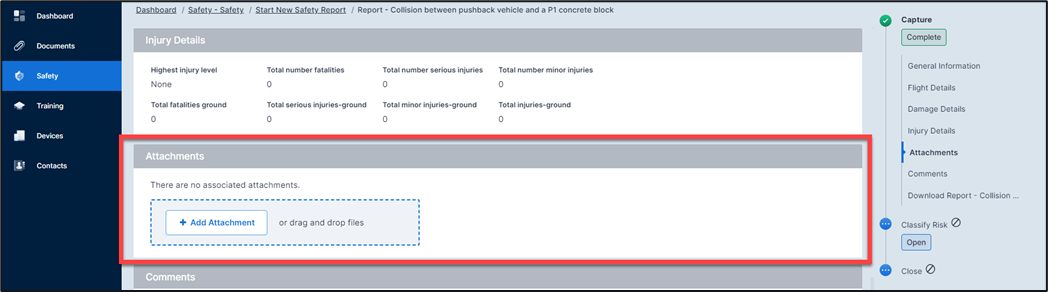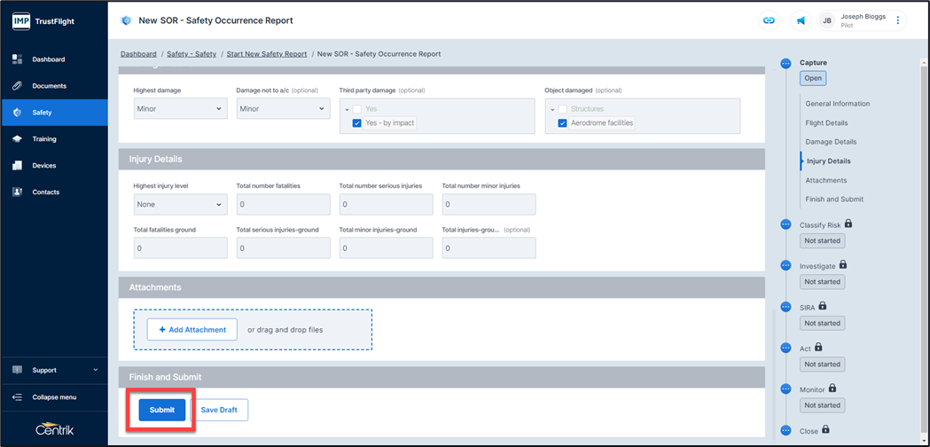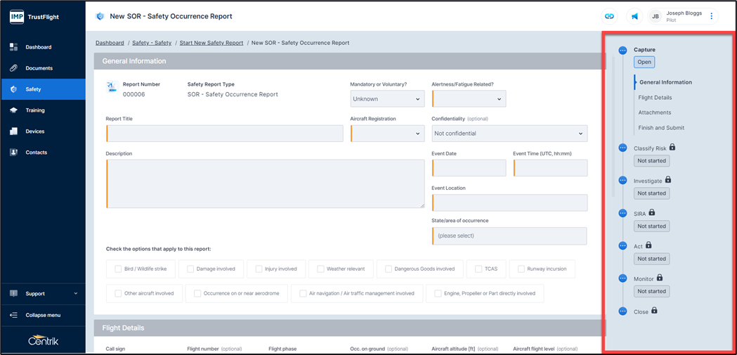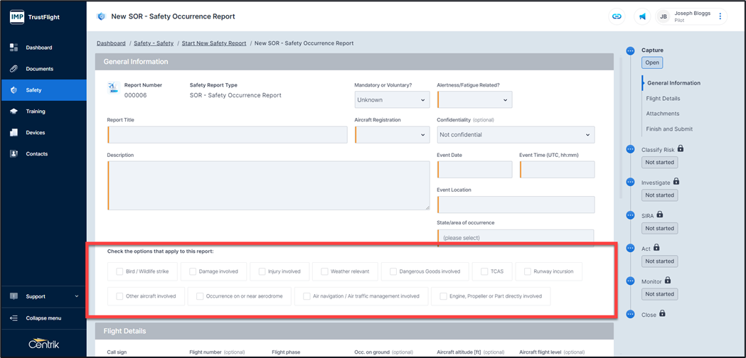 The capture phase is where specific information is collected relating to this specific event or occurrence. The details entered in this area will allow the Safety Manager to Assess and classify this event or occurrence when it moves through to the assess phase, so it is important that it contains as much information as possible.