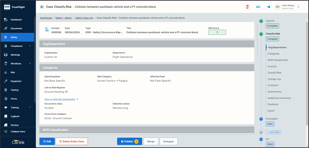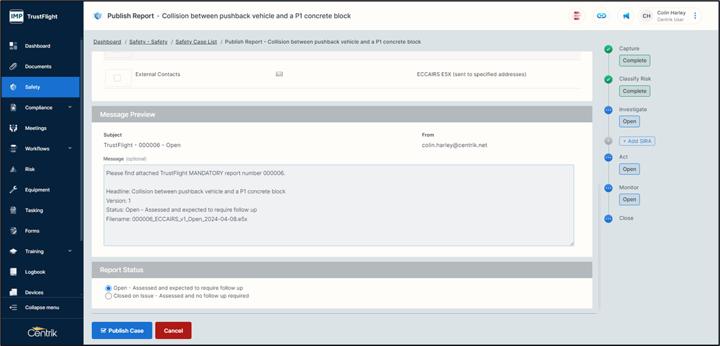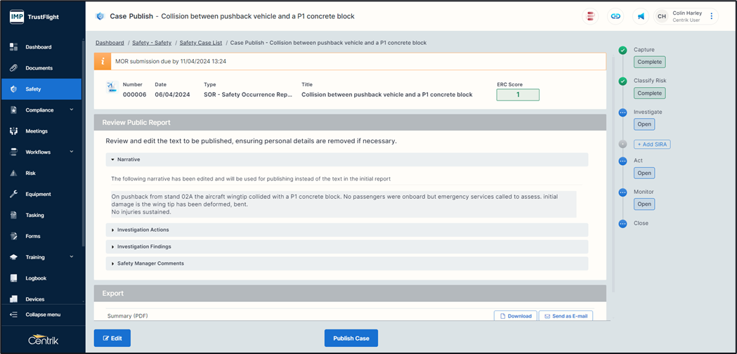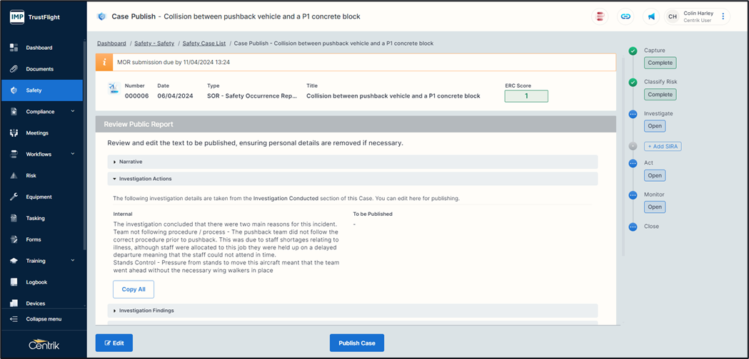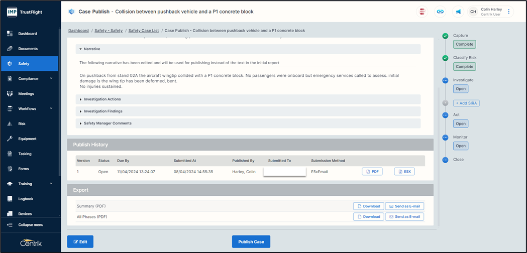 Publishing the case - You can publish the case at any stage from classify onwards. If you have completed the investigation phase and any additional phases it will contain more detailed information.