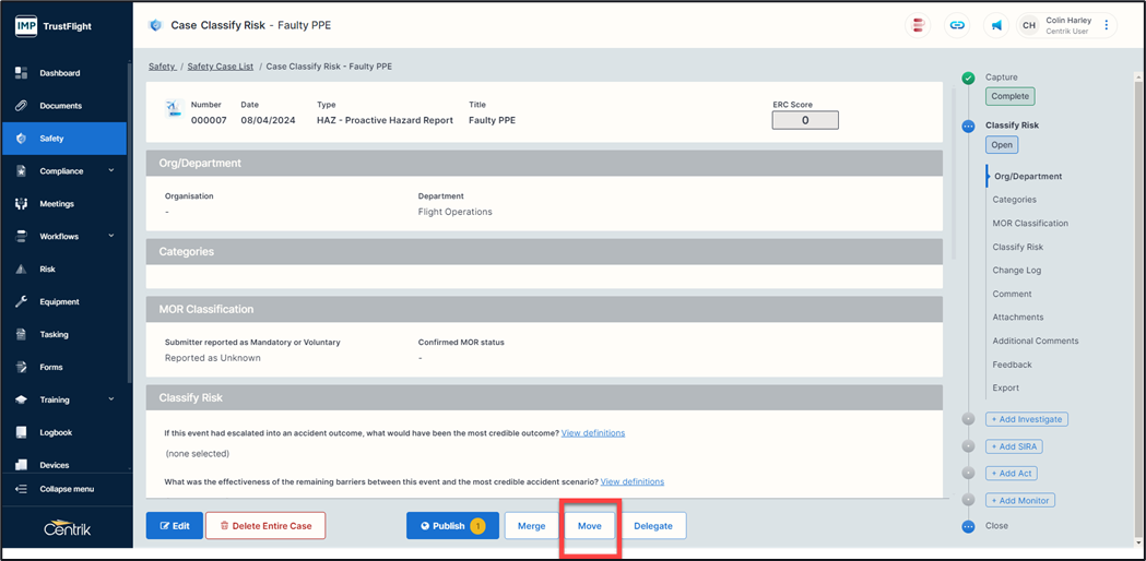(Only possible if your site has multiple safety subsystems) – The ability to move this safety case to another sub-system (the same report type needs to be available in the sub-system that you want to move this case to).