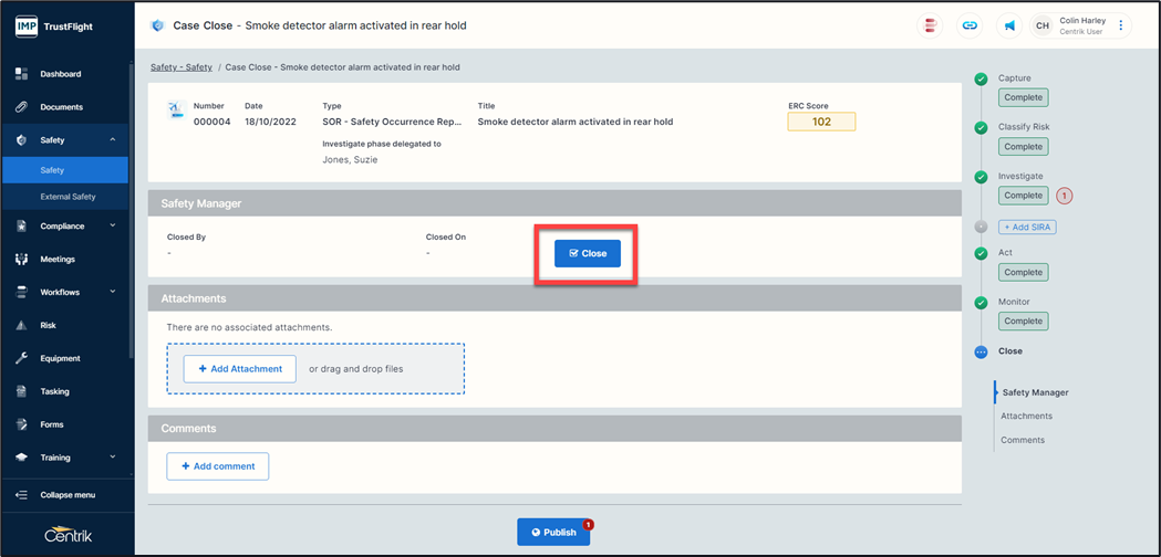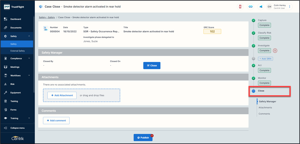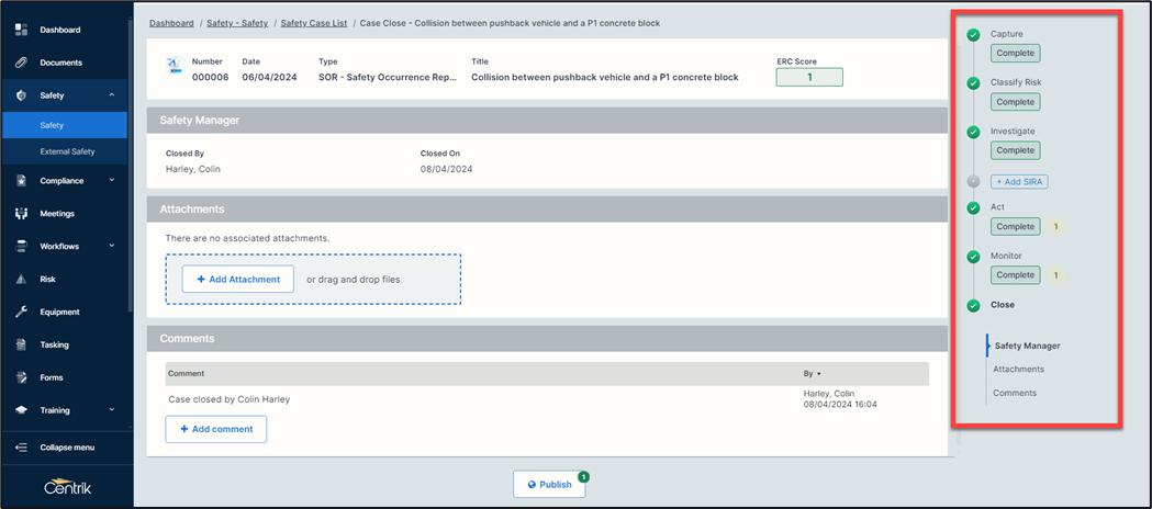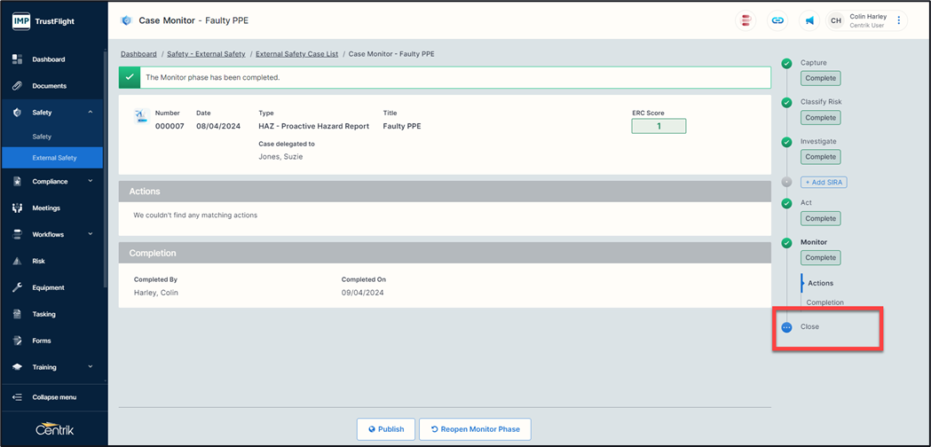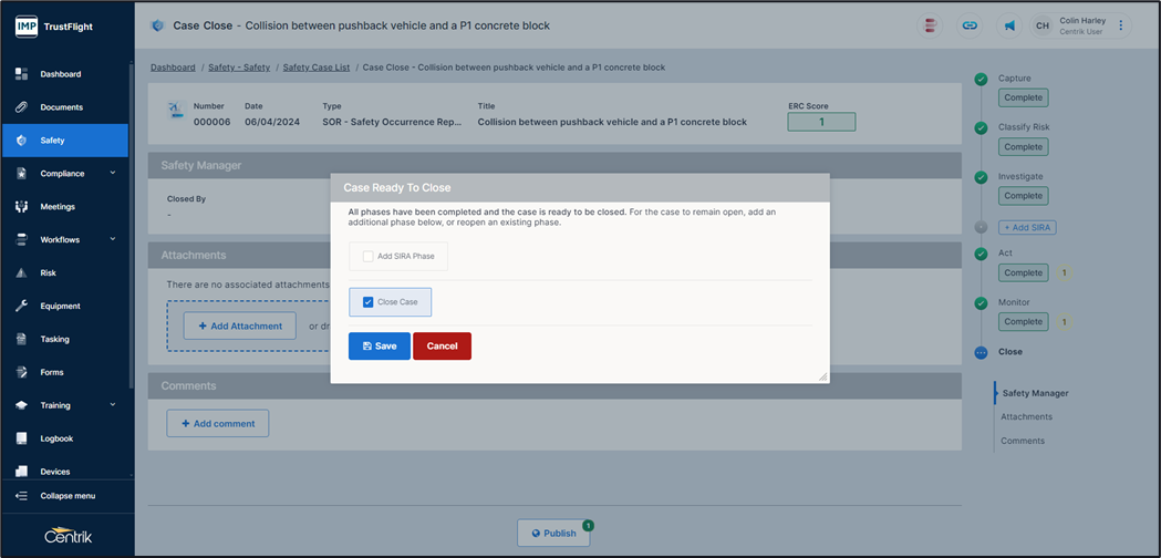 Closing a case can be configured to occur automatically after the classify phase has been completed or manually, these are configurable options of Centrik. Staged sign offs can also be configured. After all mandatory phases or added phases have been completed you will be able to close this safety case.