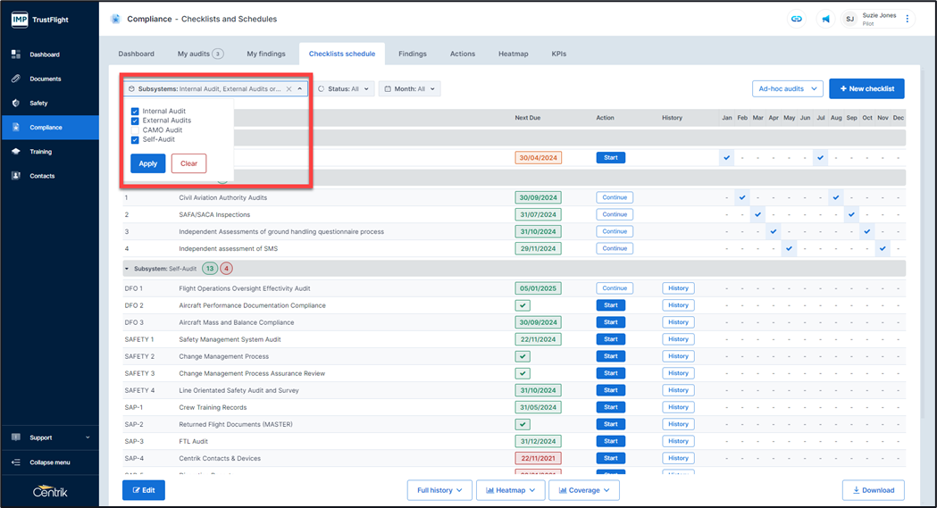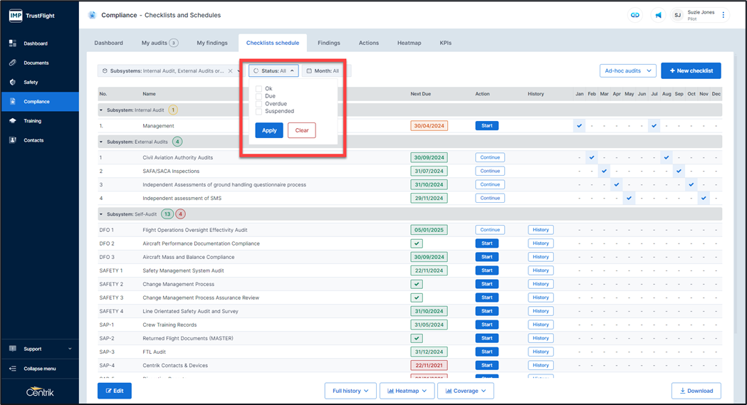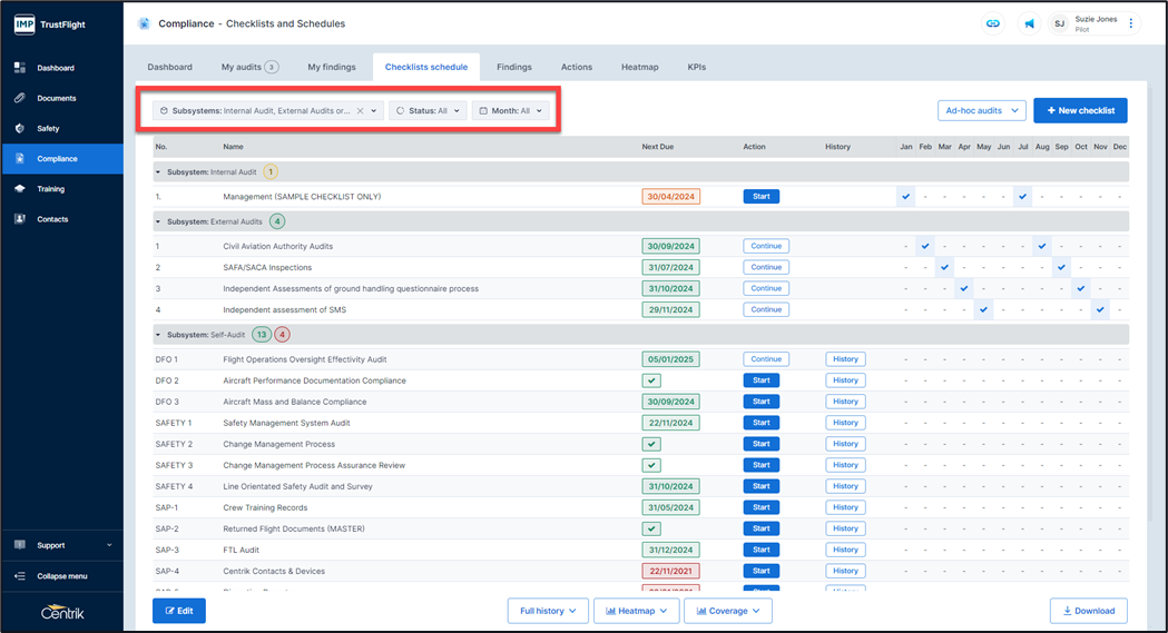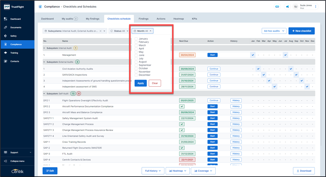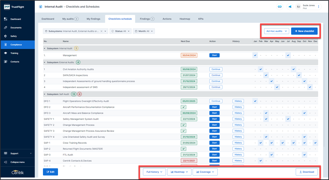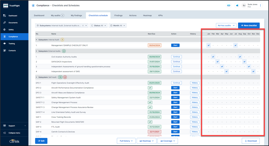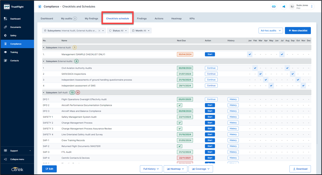 The checklist schedule area provides an overview of all audits containing a checklist that have been scheduled (the date view can be set to 12 or 24 months)