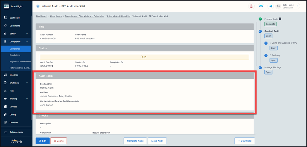 Clicking on the ‘Edit’ button I can add additional auditors (if configured) within the audit team section as well as add in a contact to notify when the audit has been completed.