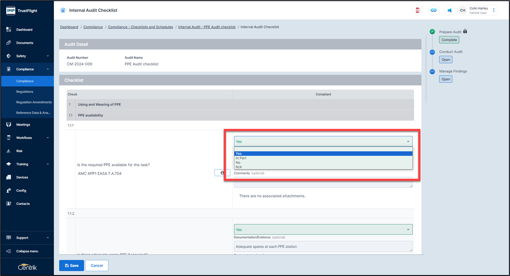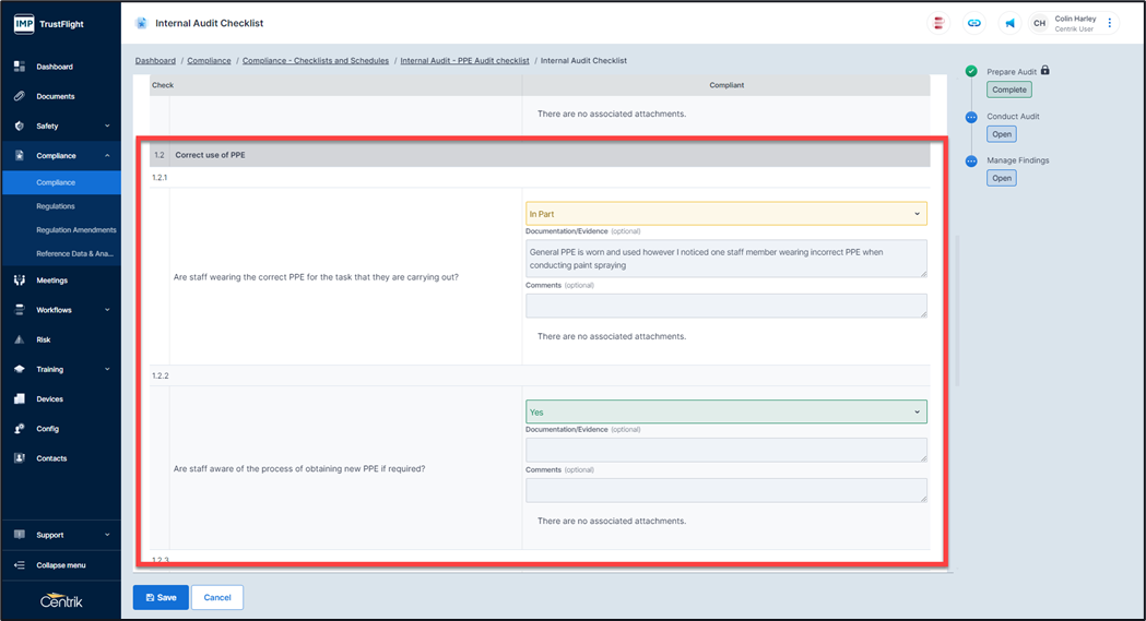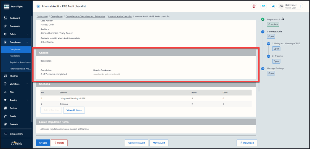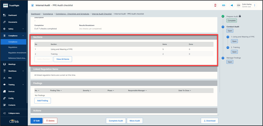 7. If there is zero non conformance or findings against any items within a section, then click on ‘Complete Audit’ button