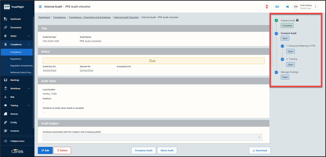 Or, opening from the audit sections area.