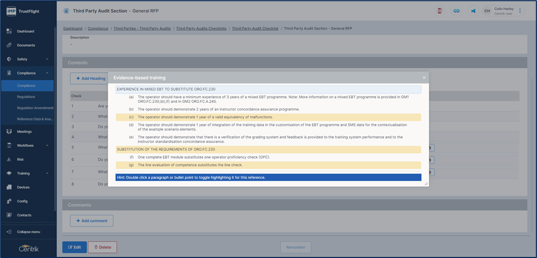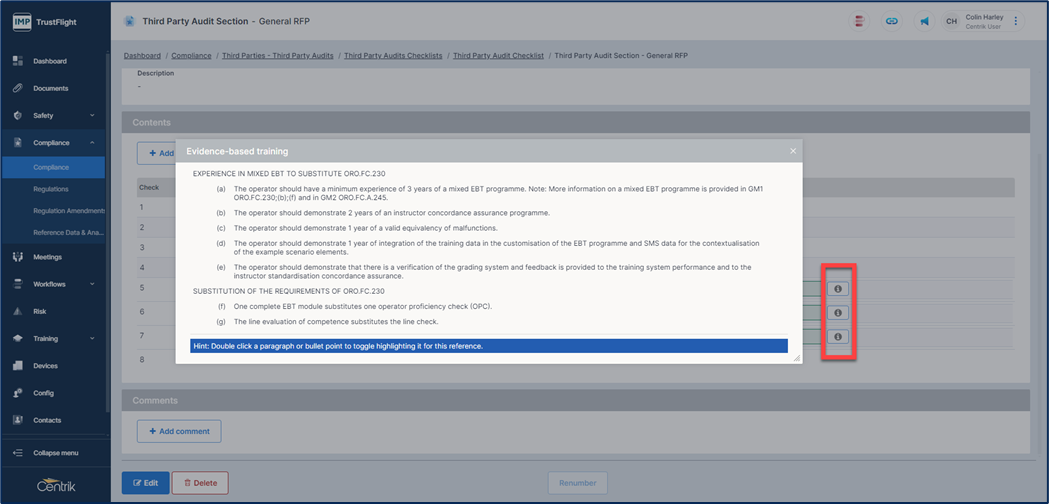 Using the ‘i’ indicator displays the regulation that is linked, you can highlight areas of the regulation too, double clicking the area of the regulation while it is displayed allows you to highlight different sections of the regulation.