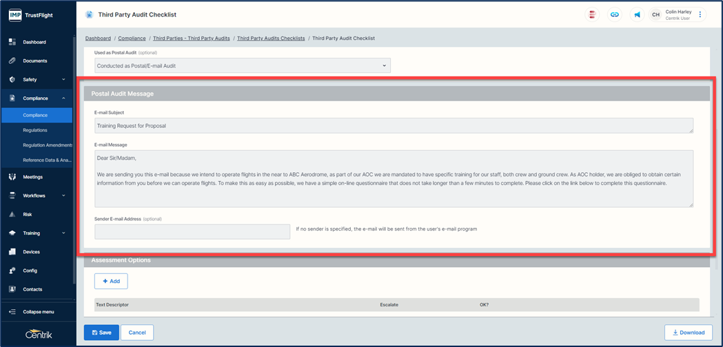 Used as Postal Audit - You can configure this audit to be carried out by the vendor via email. selecting the dropdown ‘Conducted as Postal/E-mail Audit’ or ‘Conducted by auditor after E-mail Inquiry will display an email message box.