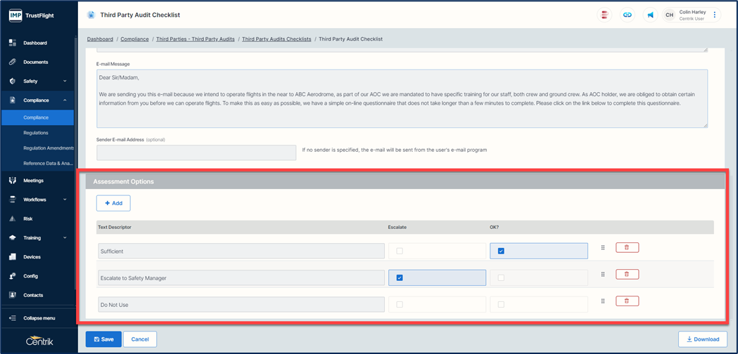 6. Scroll down the Assessment Options section, within this section you can choose how to score your audit against your third-party checklist. Ticking the checkbox for OK means that this provider is okay to use whilst you can also escalate (if required) by ticking on the Escalate checkbox