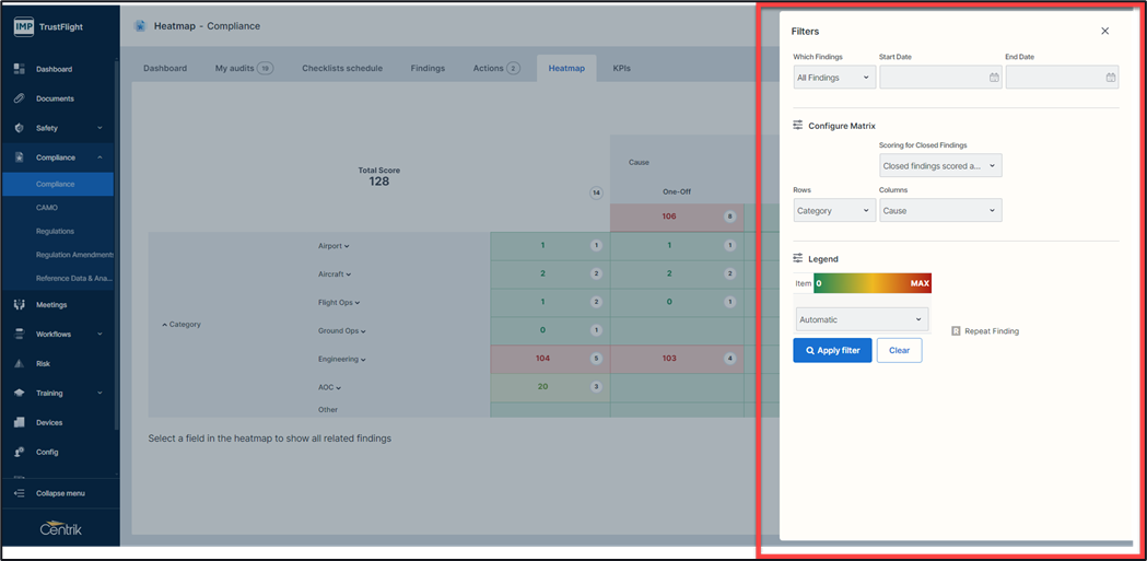The ‘Show filters’ button allows the heatmap display to be altered based on options such as All Findings, Open Findings, Closed Findings as well as selecting different options relating to the Rows and Columns.