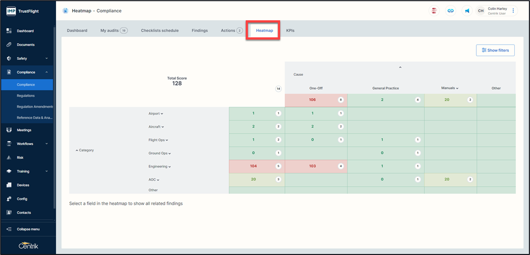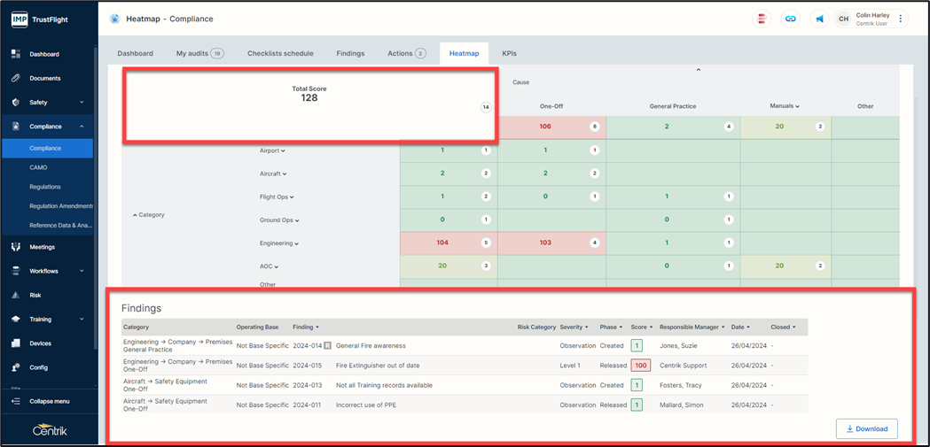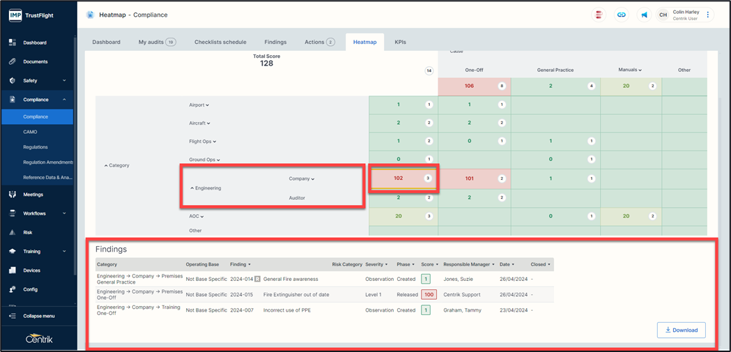 Clicking on the Heatmap displays the results based on any findings and the categories that are used during initial raising of the finding.