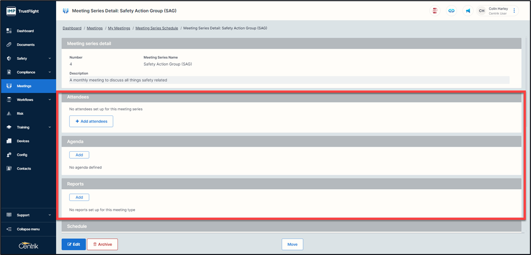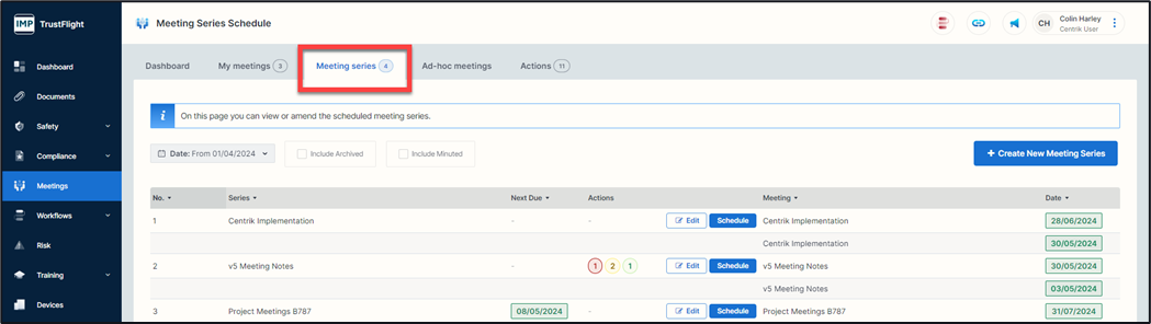 The Meeting Series section provides a summary of any meetings that have a schedule attached to them, they therefore occur at regular intervals. It will display all scheduled meetings for that specific subsystem whether you are a meeting owner, meeting attendee, or neither of those (a number is displayed highlighting my involvement (owner or attendee) across all meetings).
