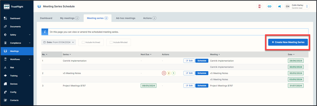 1. From the Meeting series tab Click the ‘+ Create New meeting Series’ button