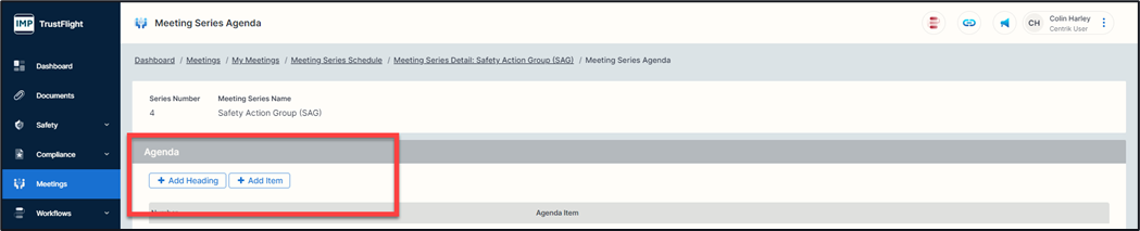 2. Click on the ‘+ Add Heading’ or ‘Add Item’ button to start adding in headings and items to build your meeting agenda