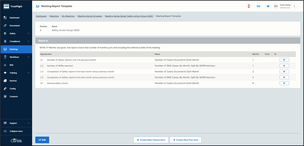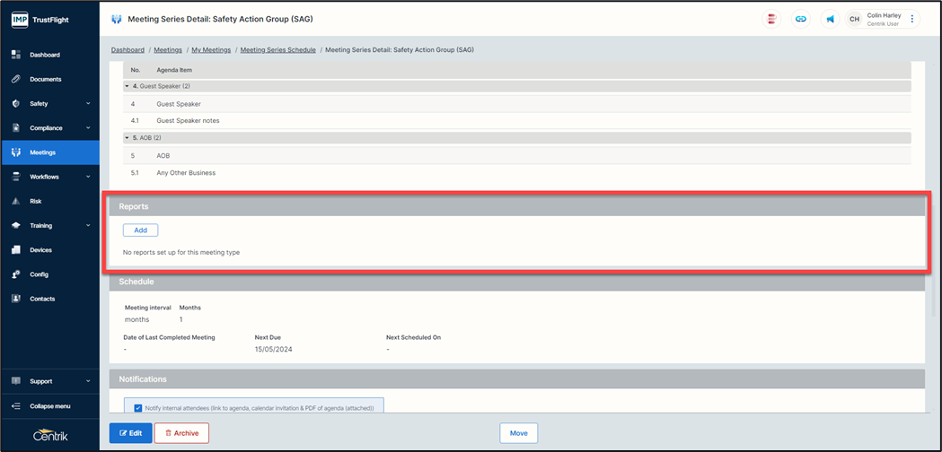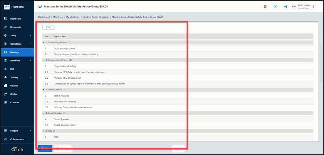 Any pre-existing meetings can be edited using the ‘Edit’ button (access rights dependant) which will make changes to the meetings template.