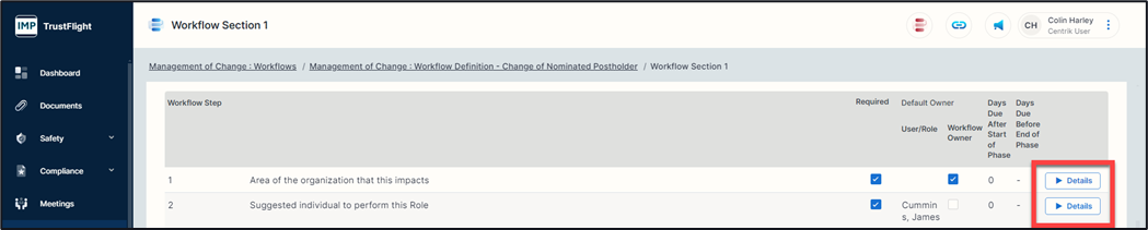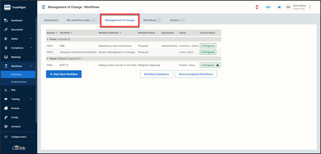 All in progress Management of change workflows will be displayed under the different stages or phases where they currently sit, there is also an area that houses any completed MOC workflows.