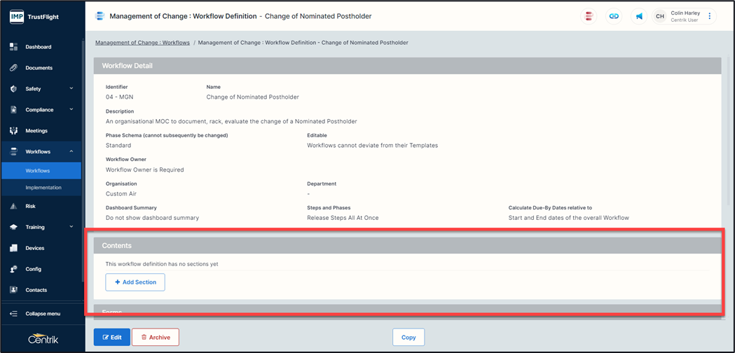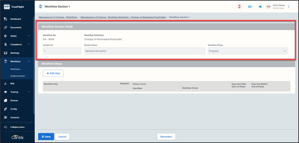 2. The Section Number is provided, this can be overtyped if required, provide a Section Name and a Workflow Phase, this will be where it sits in the MOC (depending on the Phase Schema will depend on the phases available)