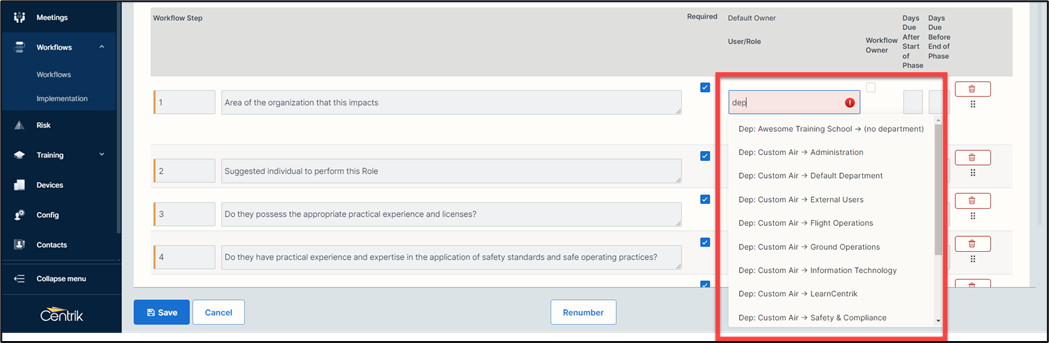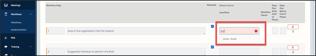 4. If you want to give ownership of this step to an individual, a Role, or a Department then use the User/Role box to input this information, typing in the box a name will display names matching those letters, to enter in a Role type the word Role and select from the organizational options, to enter in Department, type the word Dep and select from the organizational departments listed.