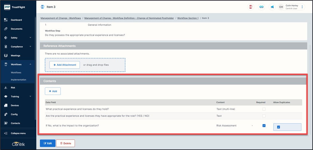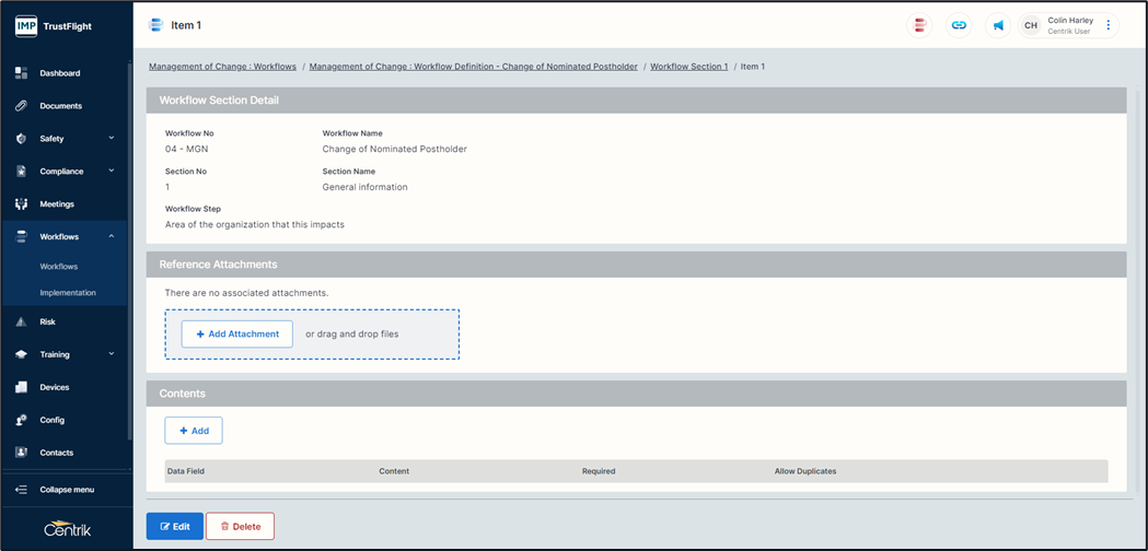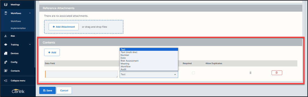 You can add in any reference attachments within this area, if required or use the ‘Add’ button, this provides the ability to create additional fields or link to other areas of the system that are related to this workflow step