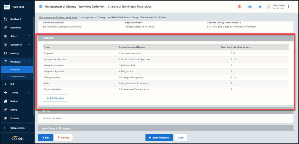 7. Move back to the main page of your workflow, continue adding sections and the details required within each section, selecting an appropriate phase for each section