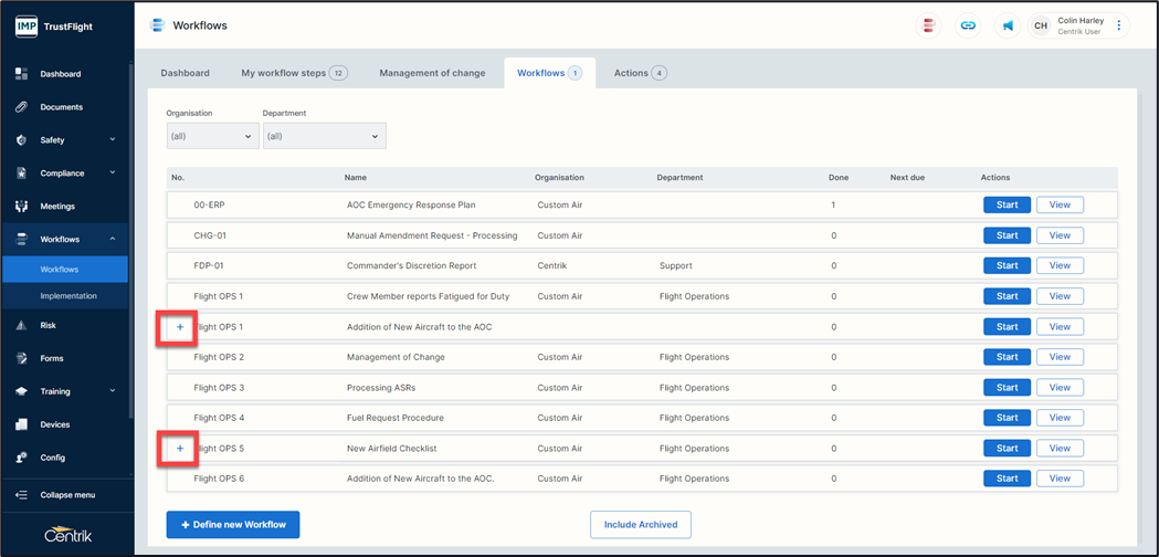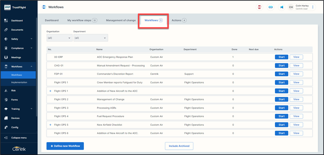 There are filtering options available to sort by organisation and department alongside a list of workflows within that subsystem.