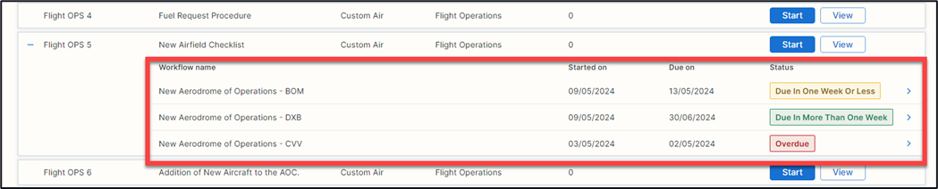 Once a template of a workflow has been created you can initiate several individual workflows based on that template. Clicking on the ‘+’ button will display a list of all workflows of the same type alongside providing a summary of what stage they are currently at.