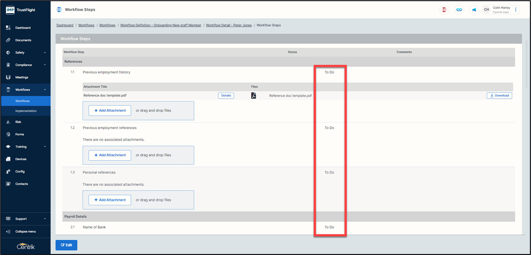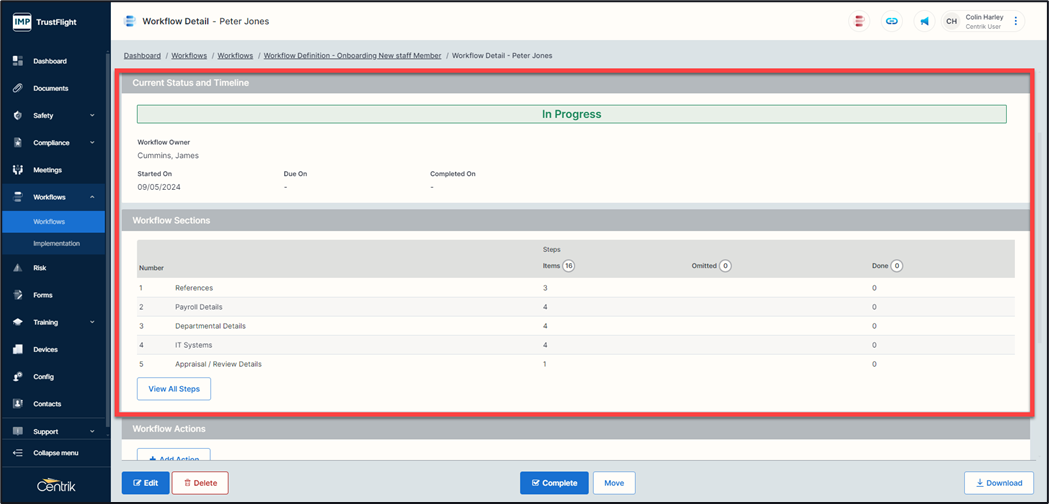 After starting your checklist, the workflow will display an in-progress highlight. Within the Workflow steps area each section and the number of items it contains is displayed.