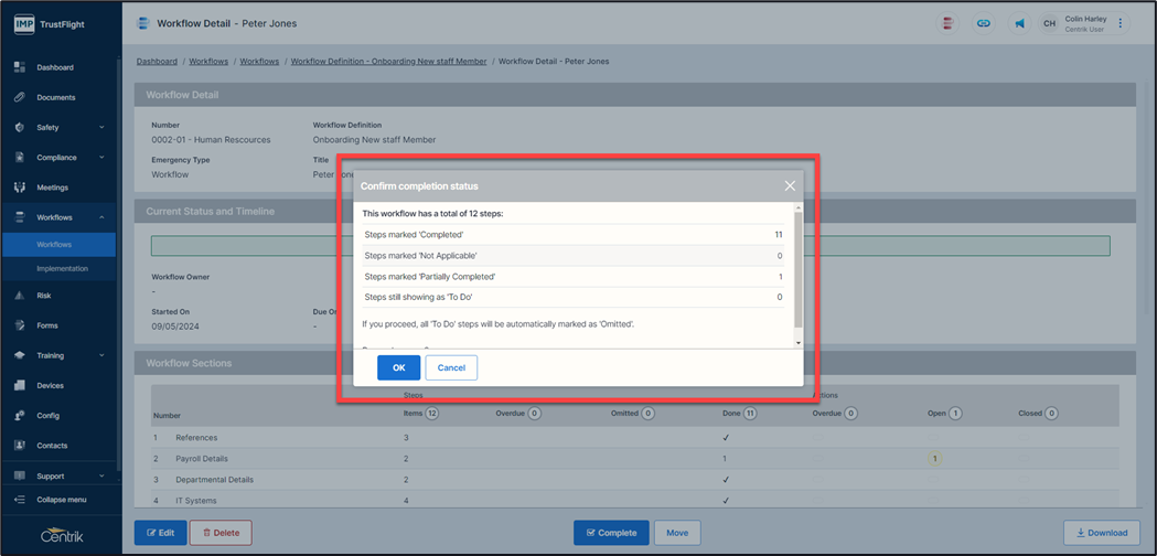 5. Click on the ‘OK’ button to confirm you wish to complete this workflow.