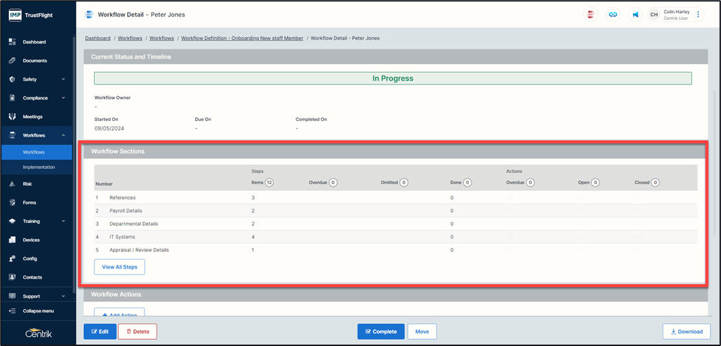 After starting your checklist, the workflow will display an in-progress highlight. Within the Workflow steps area each section and the number of items it contains is displayed.