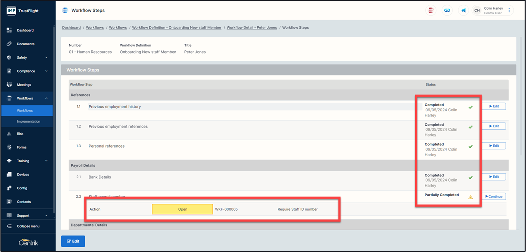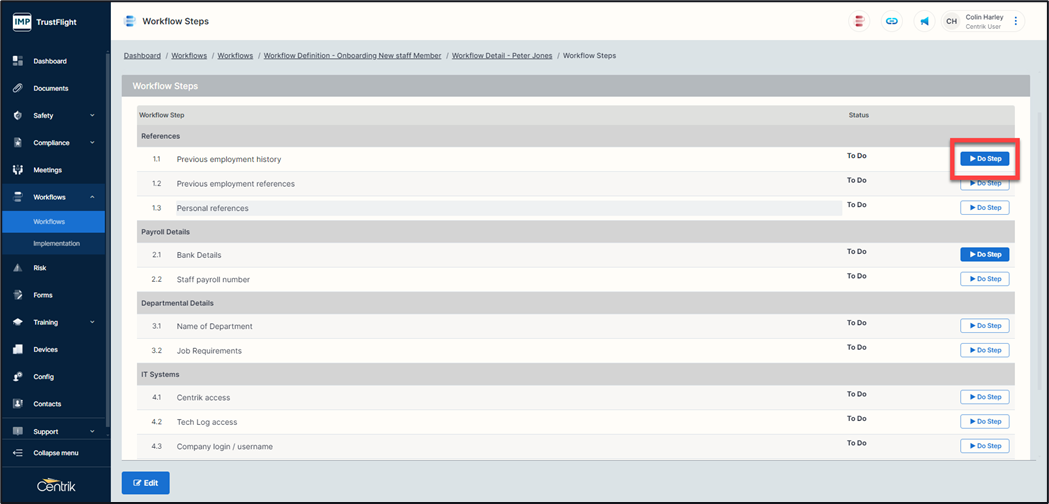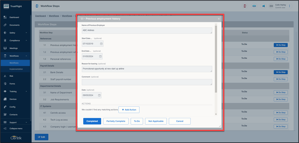 Once completed the step s date stamped and stamped with the user’s details who completed the step, any actions are also displayed.