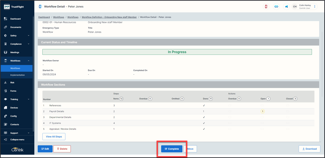 5. Click on the ‘Complete’ button to complete the workflow
