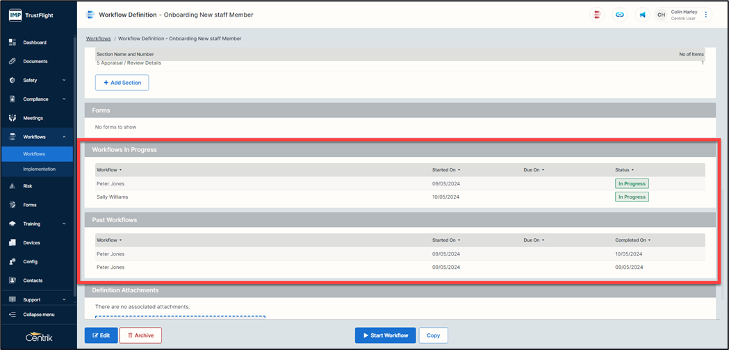 As well as the overall summary page each workflow contains its own summary view, this provides details of completed, and in progress workflows of this type.