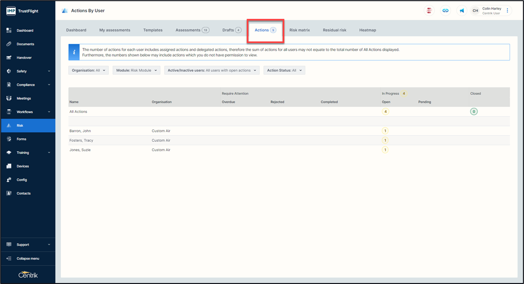 Any actions that are created as part of the risk assessment process can be viewed under the Actions tab.