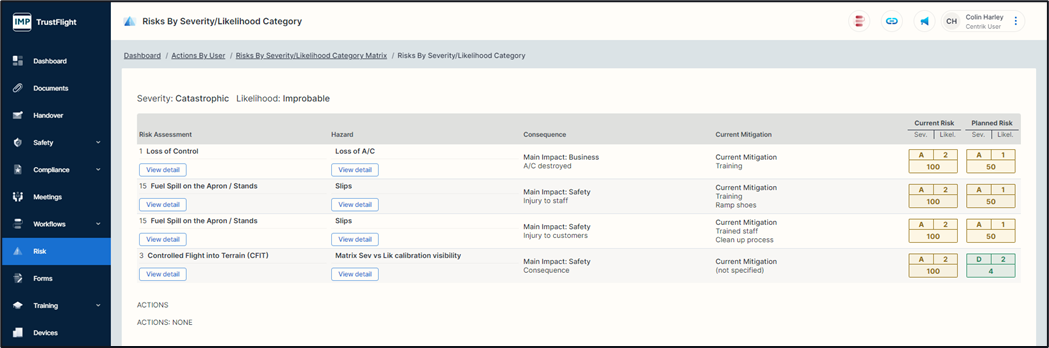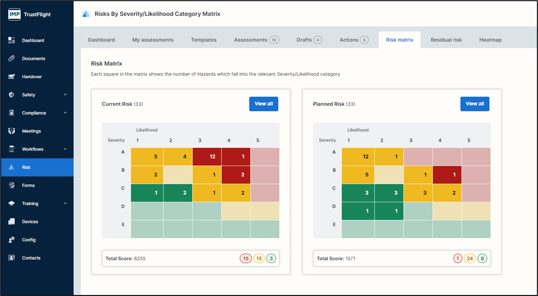 TrustFlight Support can create Risk Matrixes within the configuration settings that match an organisations Risk Matrix. These are supported by calibrated areas where risk might impact an organisation, for example Safety, Security, Environmental and General.