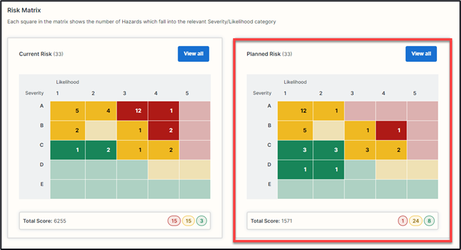 Your planned risk is the cumulative effect of all mitigations put in place against each consequence, therefore ideally the Total score should be less with fewer RED indicators and more YELLOW and GREEN indicators (risk matrix driven) versus the Current Risk area.