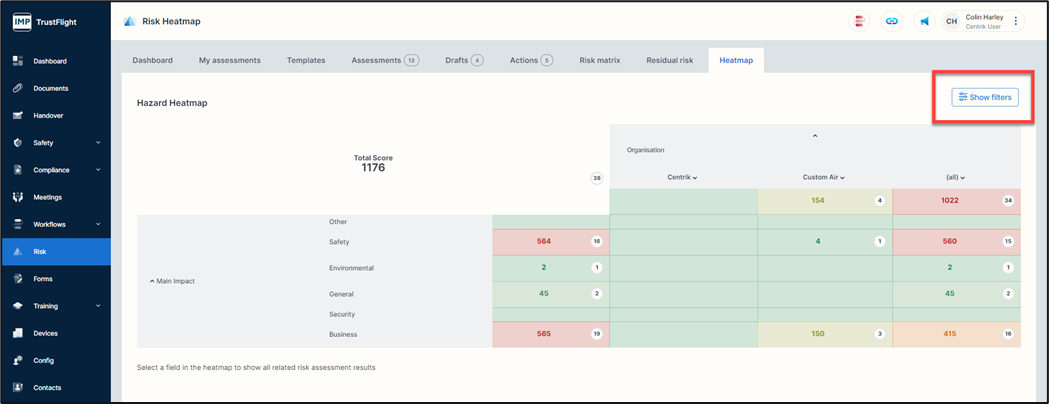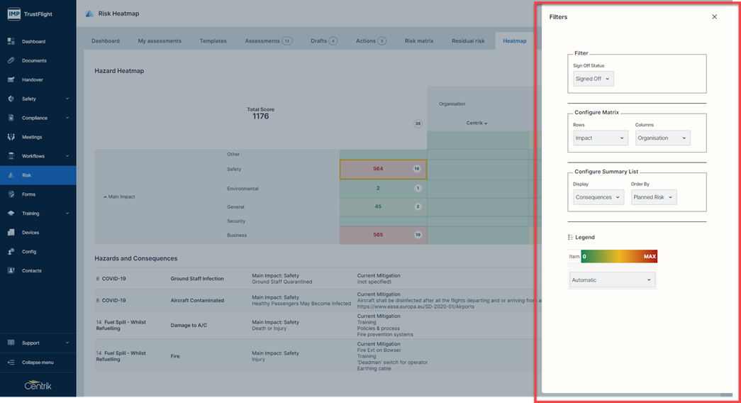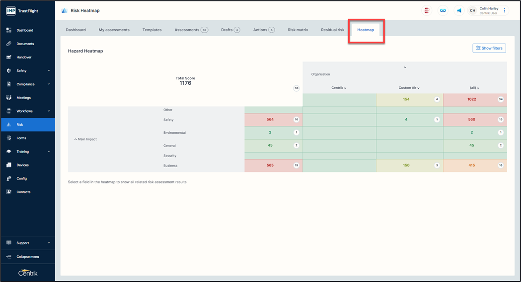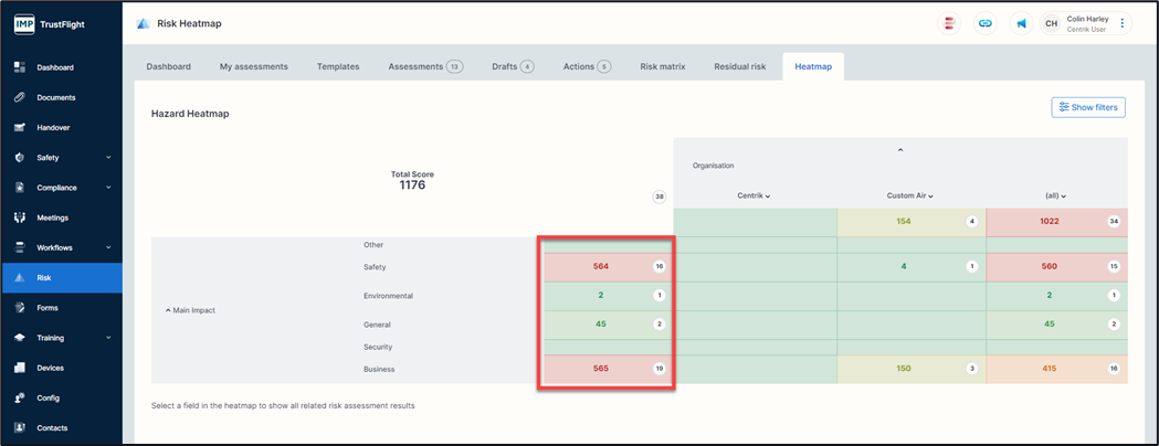 The ability to view the organisational risk via a heatmap view, broken down into key Main impact areas, you can see where your organisational risk exists.