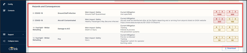 Clicking on this area displays a list of all hazards and consequences displaying each consequence, the main impact area that it relates to, any mitigations in place along with the current and planned score for that consequence.