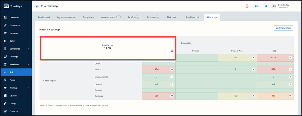 From the landing page of the heatmap the total score indicates the cumulative score of all consequences added together, whilst the number indicator denotes the total number of consequences created.