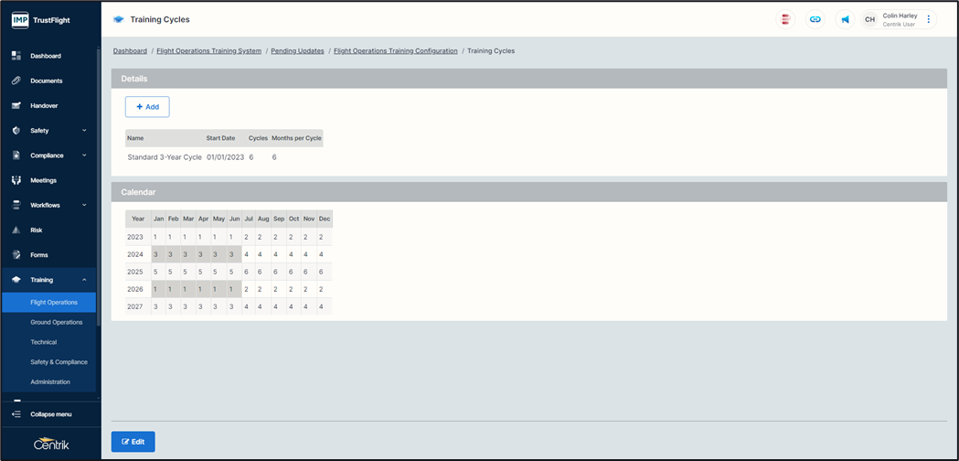 2. Clicking on the ‘Edit’ button will allow the Name of the cycle, the Start date of the cycle, and the Months Per Cycle can be amended.