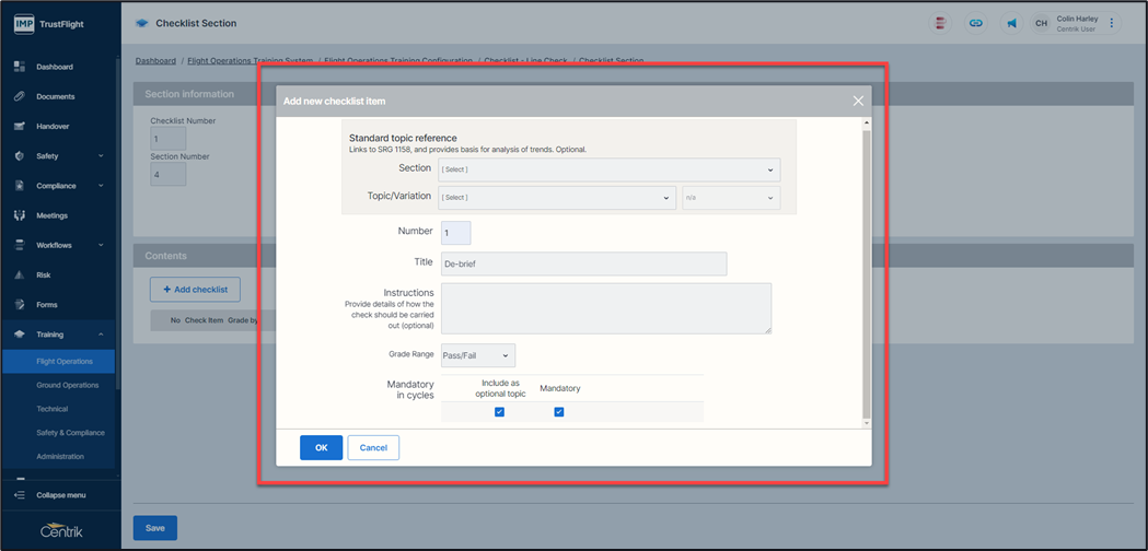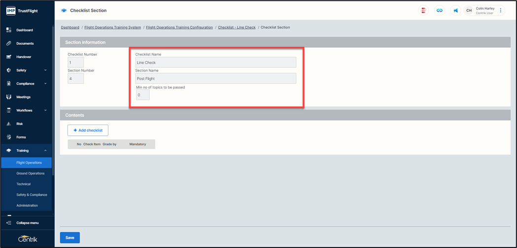 As well as displaying the Checklist Name and Section Number if required, you can add in a minimum number of topics to be passed within the section information area.