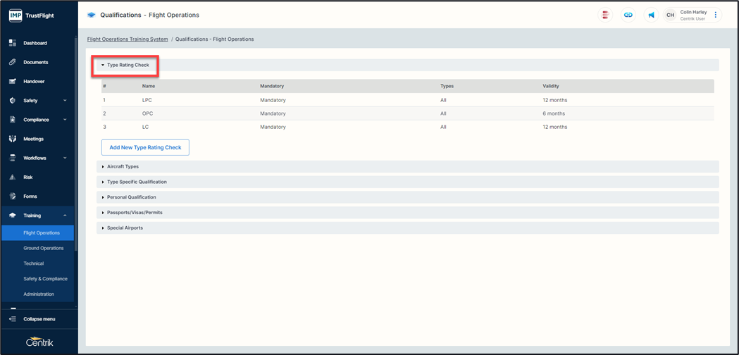 2. Click on the arrow next to Type Rating Check to expand this area (if not already expanded)