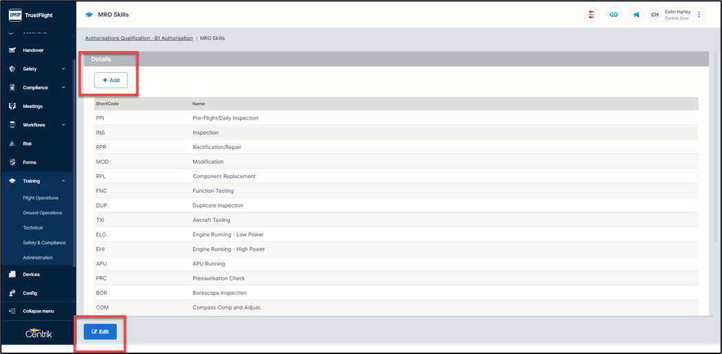 MRO Skills can be added to by using the ‘+ Add’ button or edited by using the ‘Edit button.