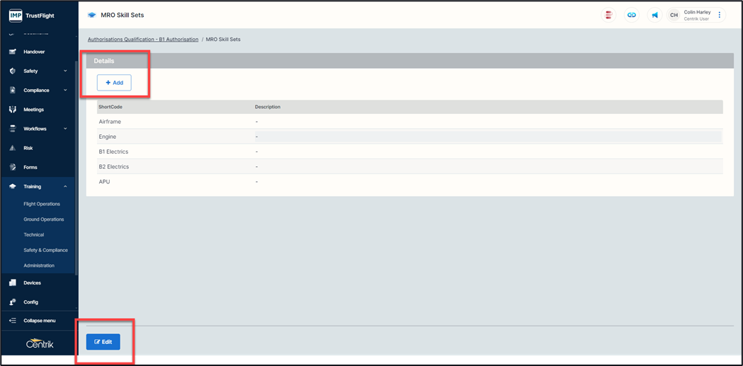 MRO Skill Sets can be added to by using the ‘Add’ button or edited by using the ‘Edit’ button.