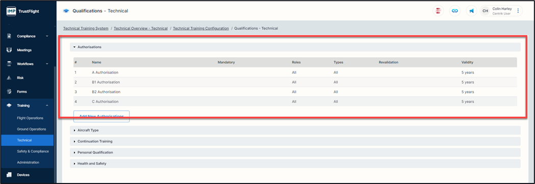 As part of the MRO qualification an authorisations area can be created within Centrik via the TrustFlight Support team and the qualification type set to MRO Authorisation.