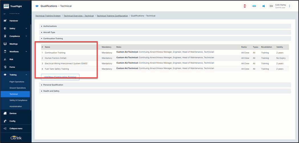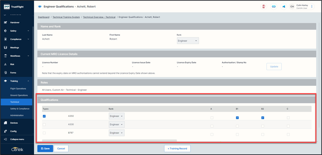 Centrik allows the creation of MRO based qualifications and the production of a system generated licence to Engineers. MRO qualifications usually take the form of prerequisite training taking place in order for an MRO qualification to be issued or revalidated.